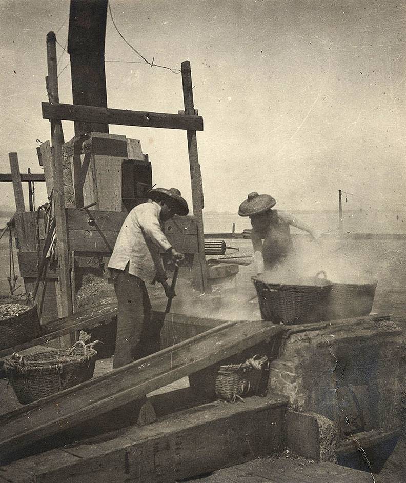 The Chinese fishermen sailed their redwood fishing boats to the mudflats. They dropped sail and set the large, triangular nets by staking them into the mud in long lines. The mouths of the nets were set open to the oncoming tide to catch shrimp swept along by the current. As the tide slackened, the fishermen raised nets and dumped the live shrimp into large baskets that were then stored in the boat’s hold. The nets were reset in the opposite direction for the next tidal cycle. After two tidal cycles, or about twelve hours, the holds were full and the fishermen returned to camp to process the catch.