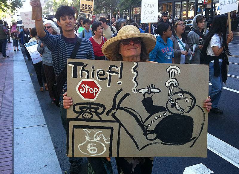 On strike day the teachers were earning 3.5 percent less than they did in 2007, although the cost of living in San Francisco has shot up 21 percent. Faculty took multiple pay cuts over the crisis years, some negotiated, some imposed. Layoffs, mostly due to class cancellations, have fallen especially hard on part-time instructors; 174 have lost their jobs, with nearly 350 threatened by the 26 percent cut in classes announced by the administration in late 2015. The paperwork and meetings required to comply with the ACCJC demands, on top of teachers’ regular workload, amounts to speedup, according to AFT Local 2121 Political Director Alisa Messer. “The faculty feel demoralized, not just disrespected but ground into the dirt,” she says.