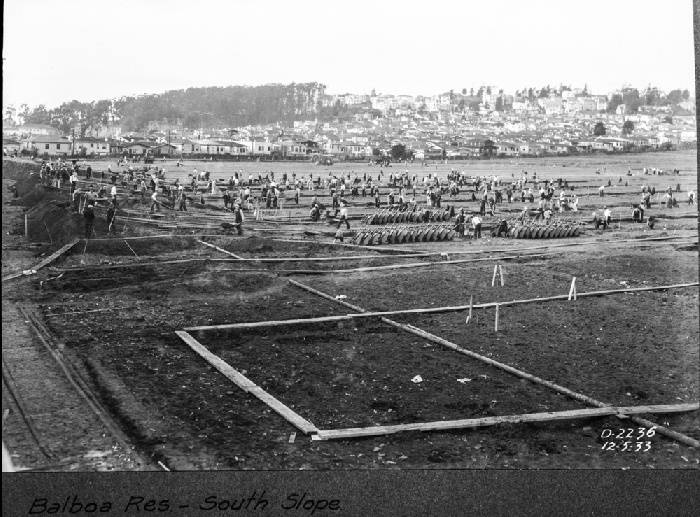 Another of the biggest projects though was one that was never finished. Long-time San Francisco City Engineer, Michael O’Shaughnessy, had been advocating for a huge water reservoir in the Balboa Park area as part of the Hetch-Hetchy water system. It was to be a 42-acre, 280 million gallon reservoir.(3) Ironically, after O’Shaughnessy lost control of the Hetch-Hetchy Project in 1932, funds to construct the Balboa Reservoir were approved by the CWA in 1933. Work started on grading and digging for the reservoir in December 1933.