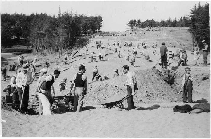 San Francisco submitted numerous project applications to the CWA and was looking to employ as many as 16,000 people.(1) These projects began by the end of November 1933 and continued into and through part of 1934. A local construction manager, Frederick Whitten was named the chairman of the local works committee and on Thanksgiving Day, November 30, 1933, he announced the assignment of workers to various projects. The biggest project in San Francisco was the construction of Lake Merced Boulevard where nearly 5000 workers were eventually employed, including 2800 men on two shifts in Whitten’s first announcement.