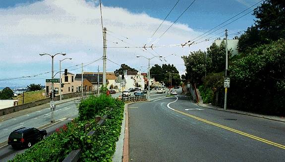 This sharp turn from Clayton to Market was not negotiable by early streetcars so operators would "switch" the backs of the passenger seats at Market Street, thereby "switching" the streetcar in the reverse direction.