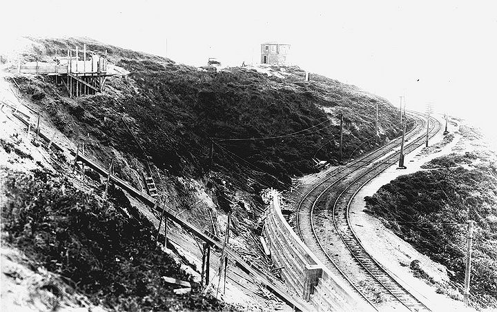 El Camino del Mar at far left, looking west towards Land's End. Cliff House railroad tracks abandoned after February 7, 1925 landslide.