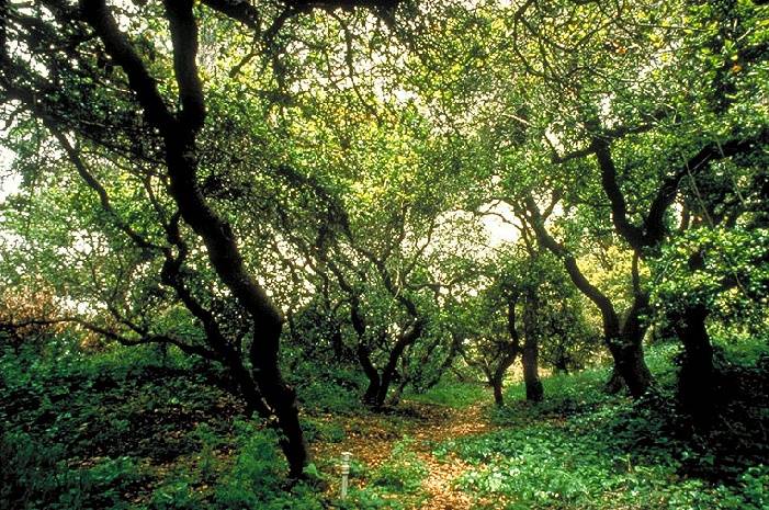 As the most abundant oak in early San Francisco, the coast live oak was among the most important sources of food for the Ohlone Indians. Acorns, whether roasted or ground into meal, provided high-protein calories year-round and were especially important during winter and other times of scarcity. Some Ohlone tribes used a decoction of its bark and insect galls for toothaches and leachwater from acorns for diarrhea. Its wood was also highly prized for utensils, including mortars and bowls. Controlled fires, set only when the conditions were just right, would keep shrubs from encroaching on the oaks and inhibiting oak regeneration. Regular fires would keep fuel loads low, thus reducing the risk of a catastrophic fire that could spread into the canopy and destroy an entire grove. Set at the right time, fires helped prevent outbreaks of weevils and other pests of acorns that spend part of their lifecycle in leaf litter. Most oaks in California survived this type of fire management because of their ability to resprout, and coast live oaks, with the thickest bark of all the oaks, are the most resistant to fire damage.