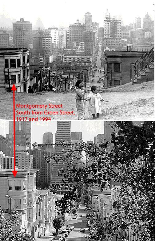 A juxtaposition of photos from the same spot, taken in 1917 and 1994, at Montgomery Street and Green Street... as you can see the exact spot where the photo was taken in 1917 no longer exists and is now air space!