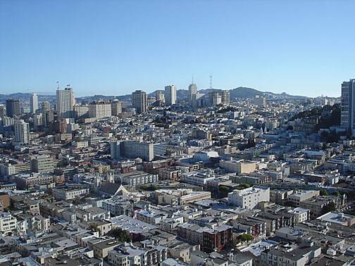 View towards southwest across Nob Hill with Twin Peaks and Mt. Sutro in distance