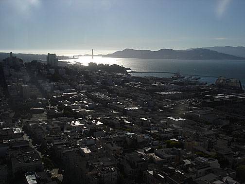 1958 aerial view from south to north of Coit Tower, Alcatraz, and Marin County in the distance.