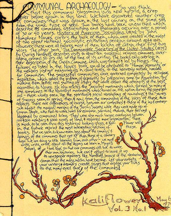 Because of the popularity and ubiquity of the publication, the commune eventually became known to most of the outside world as Kaliflower. The newsletter was published weekly by the commune from April 1969 to December 1971, and intermittently thereafter. Initially Kaliflower served as an inter-communal bulletin board, listing items needed by one commune, items offered by another, with light editorial content, and occasional poems and missives. The newsletter also contained how-to articles and skills sharing. In a Kaliflower from November 26, 1970, an article provided instructions for building cold boxes to grow food, as well as a recipe for squash soup. The Kaliflower from December 10th, 1970, offered instruction for “Yoga Nazal Cleaning” and herbal hair care. Gradually the editorial content of Kaliflower became more involved, offering historical context for modern communalism among a long lineage of American utopian experiments. In the cover article “Communal Archaeology,” from May 6, 1971, the first issue of Volume Three with a larger format, the authors acknowledge the debt the communal movement of the 1960s and 1970s owed to the Revivalist explosion of communes in the 1820s and 1840s, notably the Oneida Commune of John Humphrey Noyes: