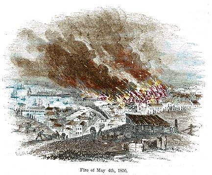 San Francisco burned repeatedly in the early years; this shows the fire of May 4, 1850, which destroyed a large of downtown.