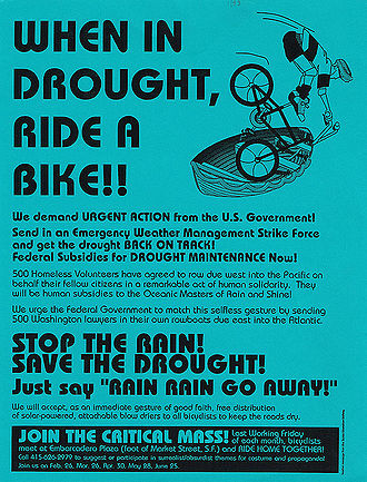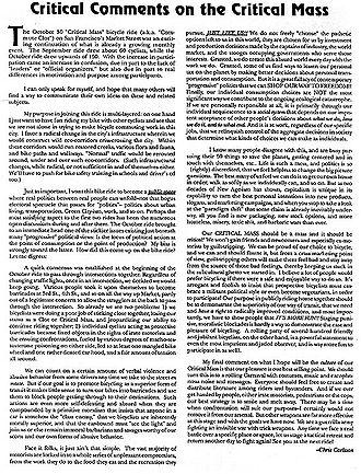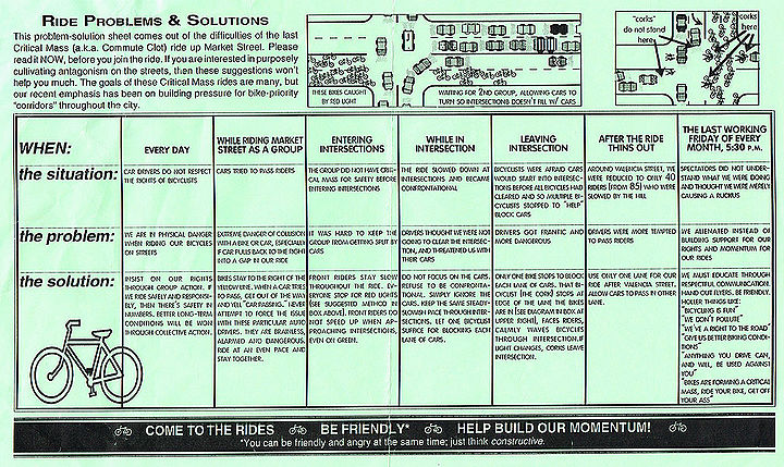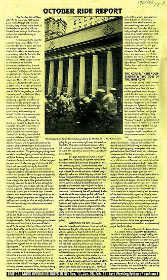 First-ever flyer inviting people to ride together, September 1992This flyer by Steven Bodzin went out simultaneously in mid-September 1992. Ironically, the back side was an advert to join the SF Bicycle Coalition!Critical comments on Critical Mass after the first two rides by Chris CarlssonOctober 1992: This image by JR Swanson was used many times during the first months and became an iconic representation of the early Critical MassJoel Pomerantz made this elaborate chart and distributed it at the 3rd Critical Mass in November to address many of the issues that had already emerged from the startSilly invite to the December ride, 1992Another silly invite to the January 1993 mid-winter (and mid-drought) rideThese were produced as flyers and as sheets of small stickers in February 1993flyers and stickers of these, too, along with 4-5 other "sign" designsThe theme of banning cars on Market also became a recurrent one, starting here in March 1993March 1993 proposed route and handoutApril 1993, two-sided with "We're Sorry!" Later became small handbills handed out for a couple of yearsFlipside of Get Off Your Asphalt, April 1993Hand-painted with a tire and red paint by Beth Verdekal, March 1993First appearance of "Critical Mass Missives" which would appear monthly into 1995Solidarity with the first person whose bike was wrecked by a motorist during the April 1993 rideProposed routes started to become more elaborate as the months went by, this for May 1993Critical Mass Missives #2, May 1993, side oneCritical Mass Missives #2, May 1993, side twoCritical Mass Missives #3, June 1993Critical Mass Missives #3, June 1993Critical Mass Missives #4, July 1993, Page 1Critical Mass Missives #4, July 1993, Page 2Critical Mass Missives #4, July 1993, Page 3Critical Mass Missives #4, July 1993, Page 4August 1993August 1993, side 2