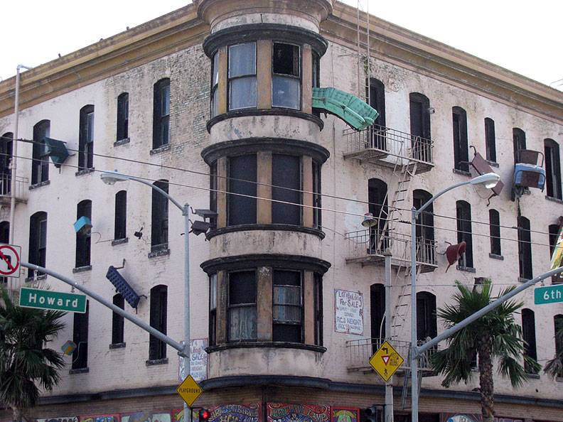The Defenestration Building, a sculptural installation by Brian Goggin at Howard & 6th Streets in SF, features over 30 pieces of furniture and home-appliances welded to the exterior of an abandoned SOMA 3-story, the former Hugo Hotel. Despite endorsement by Willie Brown and funding by federal grants, the installation survived from its installation in 1997 for seventeen years.