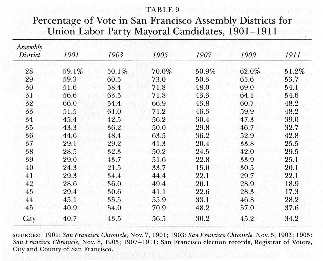 62. Ibid., pp. 16-18, esp. p. 18. Table 9 describes the ways in which the city's assembly districts remained more or less polarized over the Union Labor party between 1901 and 1911. With only three exceptions in four of the six elections, the party's mayoral candidates consistently received higher percentages of the vote than the citywide figures in the nine districts (28-36) where working-class voters pre dominated. By contrast, eight of the nine middle- and upper-class districts gave the party substantially less than the citywide percentage in two of the six elections, and seven of the nine did so in four of the six elections.