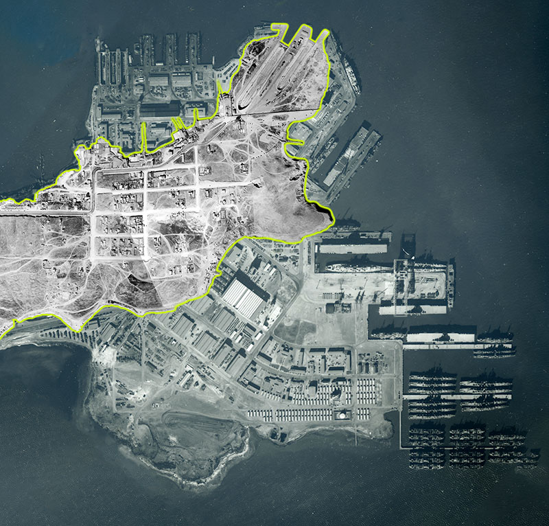Yellow line indicates original shape of the peninsula before the Navy demolished hills and filled in the bay to create the full shipyard.