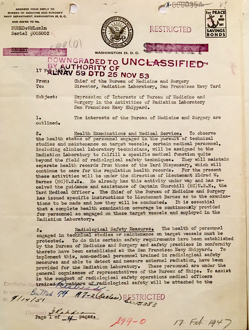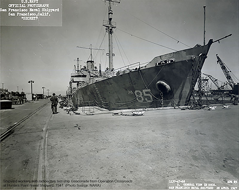Because of the expertise developed at the shipyard, Hunters Point became the Navy’s primary facility for monitoring ships from Crossroads, decontaminating 12 additional vessels and 61 support vessels by 1948. In all 79 contaminated ships from Operation Crossroads came to Hunters Point Shipyard for decontamination.