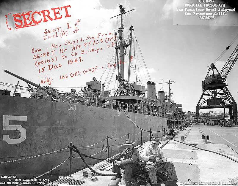 USS Gasconade undergoing decontamination at Hunters Point. Workers on lunch break.