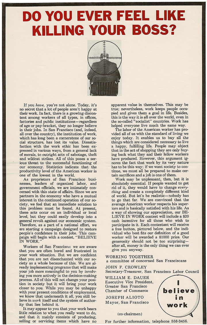 Workers of San Francisco: we are aware that you are often bored and frustrated in your work situation. But we are confident that you are not disenchanted with our society as a whole because of this. We are already implementing programs that will make your job more meaningful to you by involving you more actively in the decision-making process. All of this will not change your position in society but it will bring your work closer to you. While you may be unhappy with your present conditions of employment, we know that underneath it all, you still believe in work itself and the system of authority that lies behind it.
