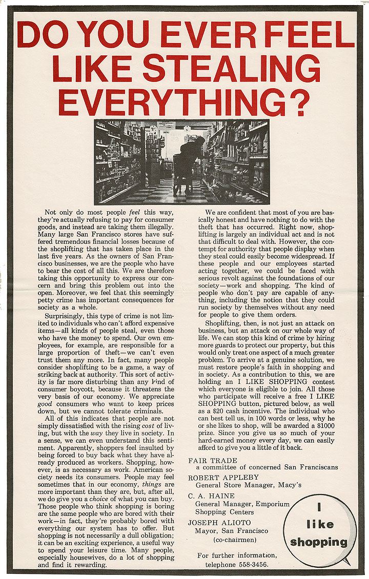 Not only do most people feel this way, they're actually refusing to pay for consumer goods, and instead are taking them illegally. Many large San Francisco stores have suffered tremendous financial losses because of the shoplifting that has taken place in the last five years. As the owners of San Francisco businesses, we are the people who have to bear the cost of all this. We are therefore taking this opportunity to express our concern and bring this problem out into the open. Moreover, we feel that this seemingly petty crime has important consequences for society as a whole. Surprisingly, this type of crime is not limited to individuals who can't afford expensive items--all kinds of people steal, even those who have the money to spend. Our own employees, for example, are responsible for a large proportion of theft--we can't even trust them any more. In fact, many people consider shoplifting to be a game, a way of striking back at authority. This sort of activity is far more disturbing than any kind of consumer boycott, because it threatens the very basis of our economy. We appreciate good consumers who want to keep prices down, but we cannot tolerate criminals.