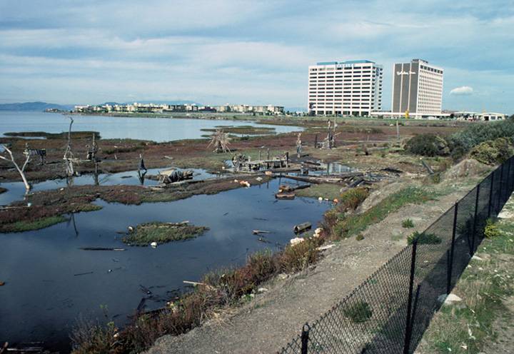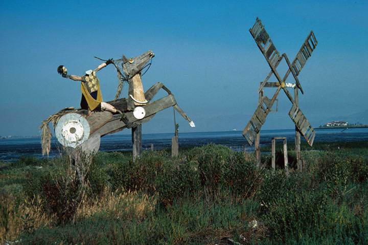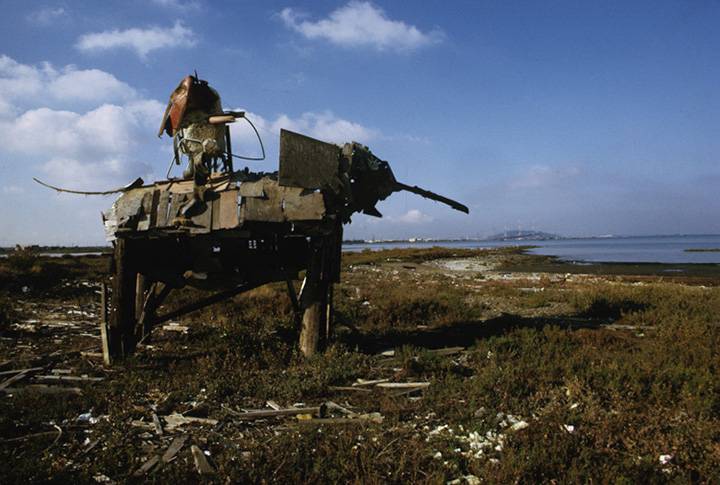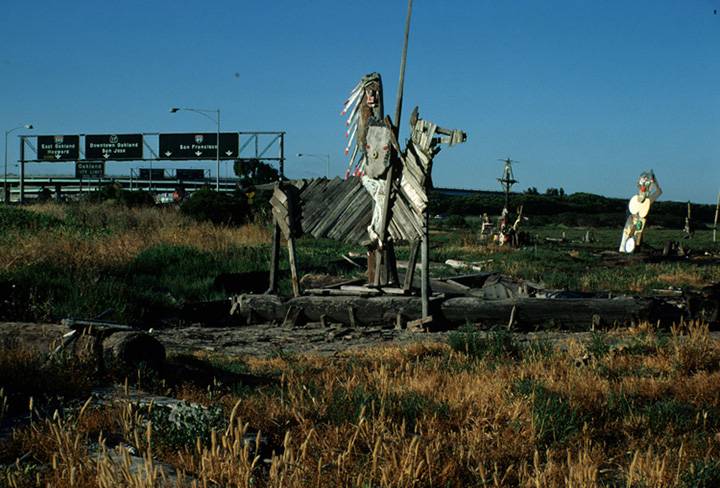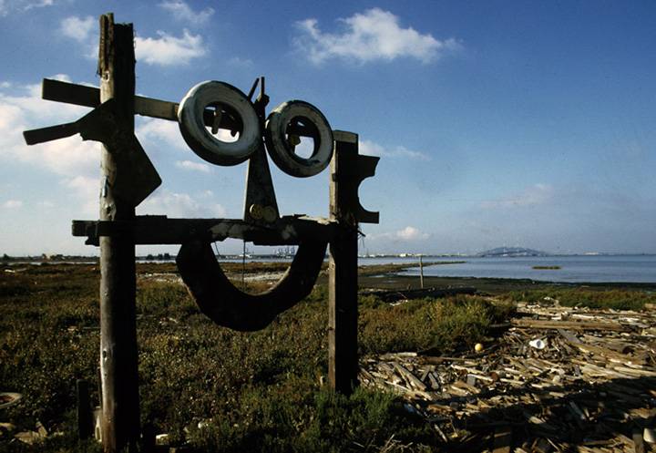 In the 1960s and ’70s, the mudflats between the Bay Bridge and the Powell Street freeway exit from I-80 were an amazingly fertile ground for creative expression. Mostly anonymous locals went into the area at low tide and working with the driftwood that would collect there, erected large sculptures that were often whimsical, poignant, political, satirical, and surprising. Here is a small collection from Seymour Rosen, courtesy of SPACES (Saving and Preserving Arts and Cultural Environments).