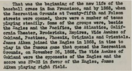 In 1924, Anita Day Hubbard wrote an epic series of articles in the SF Call Bulletin on the history of the city and the Mission which contain a staggering amount of historical detail, including these detailed paragraphs on baseball: