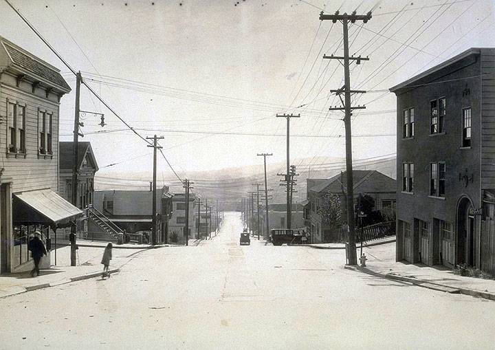 San Bruno Avenue north near present-day Alemany Blvd intersection. Bernal Heights east slope is the hill, 1927.