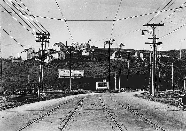 March 16, 1926, view west on Oakdale near Toland. Old Clam House is at intersection of Bayshore (then San Bruno Avenue). Bernal Heights and site of US Highway 101 in background.