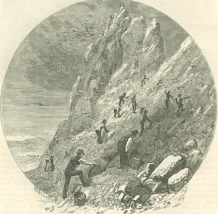 Gathering eggs at the rookeries on Farallon Island, 1874.