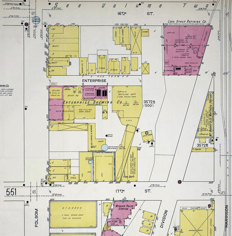 1914 Sanborn Insurance map showing Enterprise Brewery on Enterprise Alley between 16th and 17th, Folsom and Treat (then Division).
