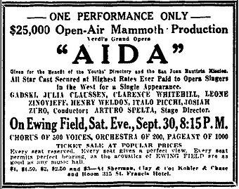 Then came the Aida fiasco. On September 30, 1916 Ewing Field was to be the scene of the grand outdoor performance of Verdi’s Grand Opera set in Egypt. Weeks of preparation and rehearsals with a 500-voice choir, 200 musicians, 100 dancers and 1,000 supernumeraries on a stage larger than the infield (100 x 125 feet) were all for naught. Twenty thousand tickets had been sold but the performance was rained out. Lloyd’s of London covered the $25,000 loss and 10,000 lucky ticket holders saw a scaled-down Aida indoors at the Exposition (Civic) Auditorium on October 3.