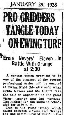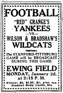 The first game on January 2, 1928 pitted Red Grange’s New York Yankee squad against George Wilson’s Wildcats. About 5,000 watched the two elevens wallow in the Ewing Field mud to a 6-0 Wildcat victory. Next week’s perfect weather brought over 7,000 who saw Ernie Nevers’ team fall 13-6 to Benny Friedman’s Bulldogs.