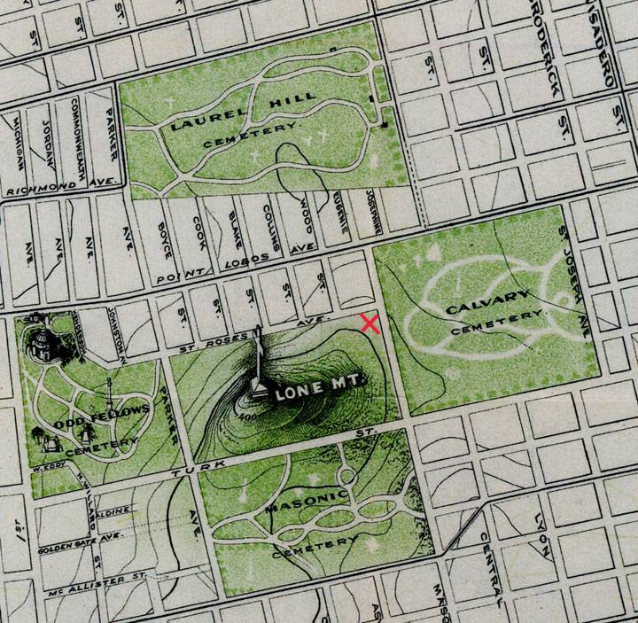 As matters stood in 1914, the new stadium would be across Masonic Avenue from Calvary Cemetery and a block north of the 38-acre Masonic Cemetery. To the west of the stadium Lone Mountain rose about 160 feet above the playing field. On the western slope of Lone Mountain was the 27-acre Odd Fellow’s Cemetery. Approximately 100,000 were interred in these three sites.