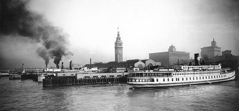 In 1850, just a year since the beginning of urbanization, the first ferry service was established between San Francisco and Oakland, running across sand bars to San Antonio Creek, better known now as the Oakland Estuary. Ferries were the main transportation choice for travelers between San Francisco and Sacramento, and points in between, and continued to be well into the 20th century. Back in 1862 the San Francisco and Oakland Railroad Company built a ¾ mile pier from West Oakland into the Bay. Thus begins a decades-long concentration of cross-bay ferry traffic between West Oakland and San Francisco’s Ferry Building. After the Civil War in 1868 real estate promoters laid out streets and docks in Sausalito and begin providing North Bay ferry service. When the first transcontinental railroads spanned the country, the original terminal was in Sacramento where passengers transferred to fast ferries to finish their trip to San Francisco and the coast. Before long the new railroad barons had acquired the local ferry services and by 1881 they extended the wharves well into the Bay on what became known as the Oakland Mole, where trains and ferries met in the Bay all the way to 1957.