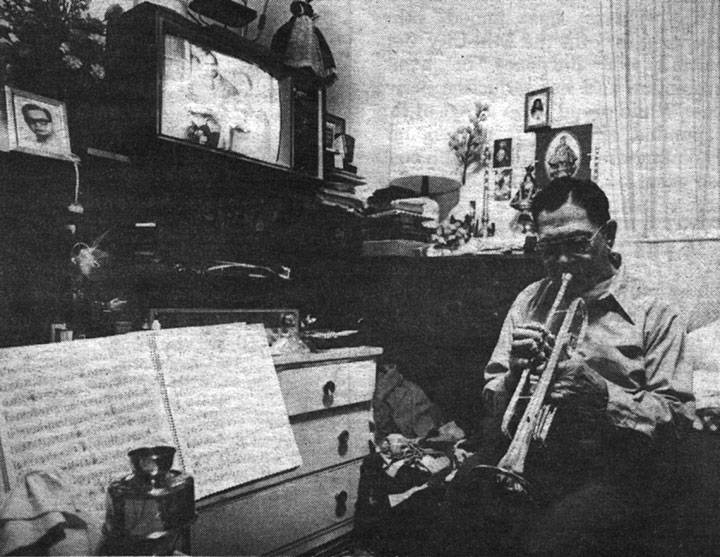 World War II veteran Pastor Ramos, 72, toots his trumpet in his Eddy Street hotel room, 1986.