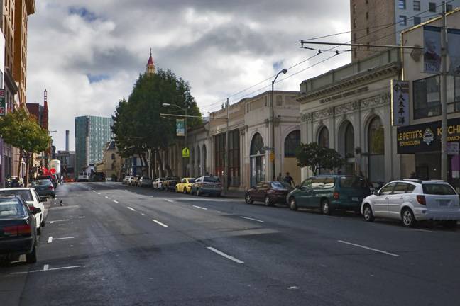 Until the end of the 1980s, businesses along this stretch of Hyde Street and around the corner on Golden Gate Avenue included Wally Heider Studios (now Hyde Street Studios), Monaco Labs and Leo Diner Films—a recording studio and motion picture labs/post-production facilities that, with the advent of acetate-based Kodacolor and black-and-white reversal motion picture film in the early 1950s, had taken over film exchange buildings. Among the notables who recorded albums at Wally Heider’s were the Jefferson Airplane, Grateful Dead, Creedence Clearwater Revival, and Crosby, Stills, Nash and Young.