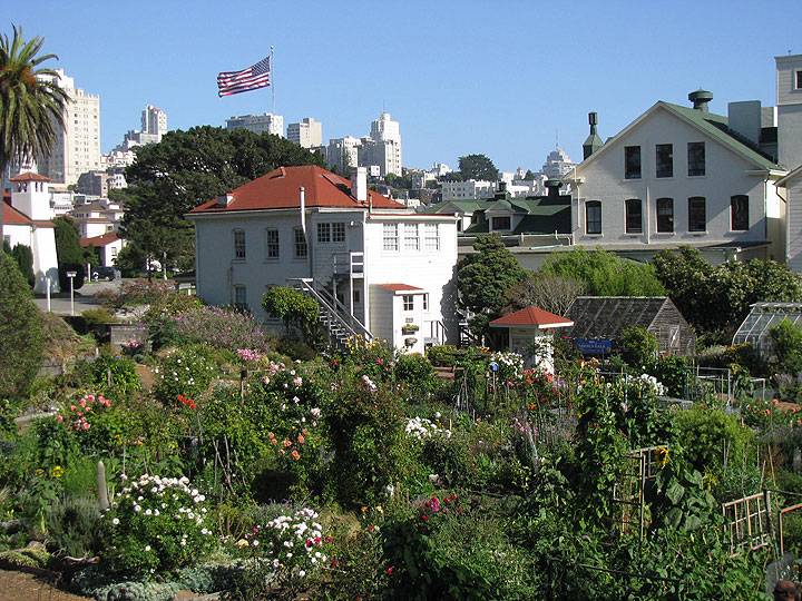 Fort Mason in northern San Francisco, Building 201 is white building at right. In foreground is the well-known Ft. Mason Community Garden, open to the public since 1976.