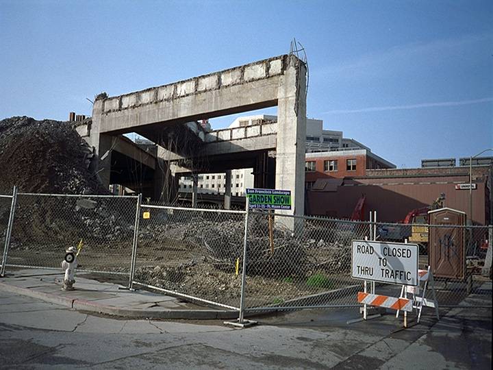 Freeway hides historic ferry building in this 1985 photo until its demolition in 1990.