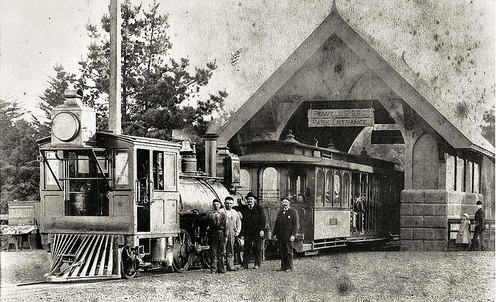 Ferries and Cliff House steam train at Golden Gate Park terminal, 7th Avenue and Fulton, c. 1895.