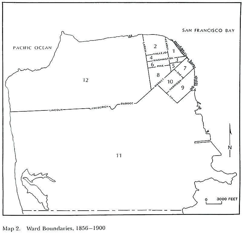 Map 2 identifies ward boundaries. As can be seen, the Democrats’ strength came from working-class sections of the city—the waterfront and South of Market, disproportionately of foreign stock (especially Irish) and Catholic. Democrats were weakest in the middle-class and upper-class areas north of Market Street, home to merchants, professionals, and others in white-collar occupations, also heavily of foreign stock but with a tendency to be German and Jewish rather than Irish and Catholic. The sixth ward, including Nob Hill, was the wealthiest area in the city and was least likely to vote Democratic. The second, third, and fourth wards were more heterogeneous, including a variety of occupations, ethnic groups, and lifestyles.(6)
