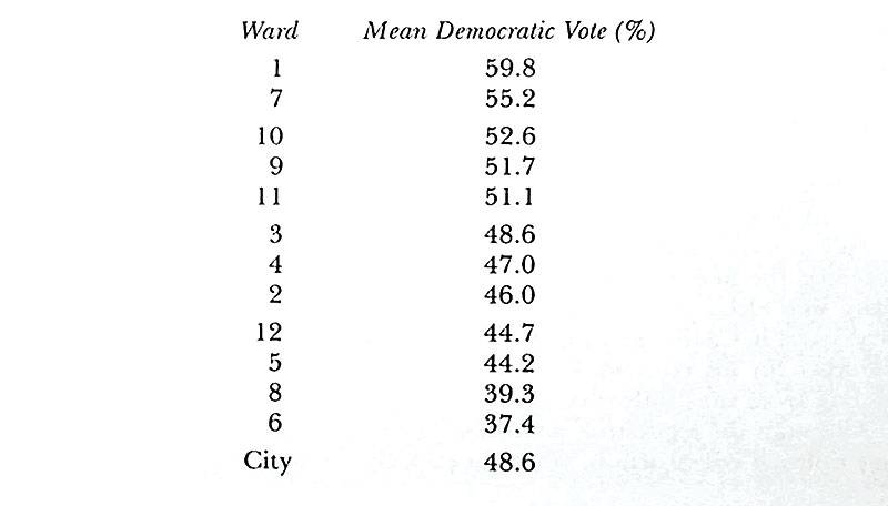 Throughout the late 1850s and 1860s, San Francisco politics was dominated by the heirs to the vigilantes, the People’s Party. Between 1856 and 1875, only one Democrat won the mayoralty. After the Civil War, however, memories of the events of 1856 receded ever further from mind. Thousands of newcomers poured into the city—many of them Irish and German immigrants—and the Democratic party began to emerge as the majority. Democrats won the mayoralty in 1875 and 1877, carried the city for their gubernatorial candidate in 1875, and usually could command a majority until the turn of the century. Arranging the city’s wards according to their mean Democratic vote between 1873 and 1877 (measured by voting for mayor, governor, and president) produces the following: