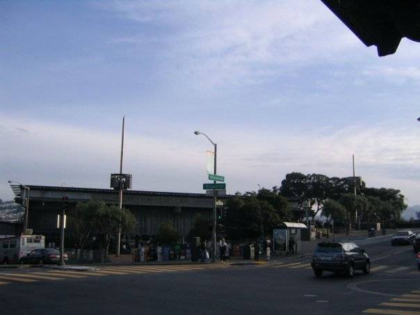 The Glen Park BART station from the far corner of Bosworth and Diamond Streets. The brick circle in the street at the right edge of the street is a cistern that holds water to fight fires if water pressure in the City's hydrants is lost in an earthquake.