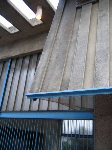 Corner of the station's fiberglass awning. Note how the pattern on the fiberglass mirrors the translucent glass clerestory of the station building.