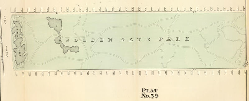 Eastern end of Golden Gate Park, 1876, with large-ish lake at site of the Sharon Children's Playground, later filled in. Original Big Four cemeteries visible at upper right.