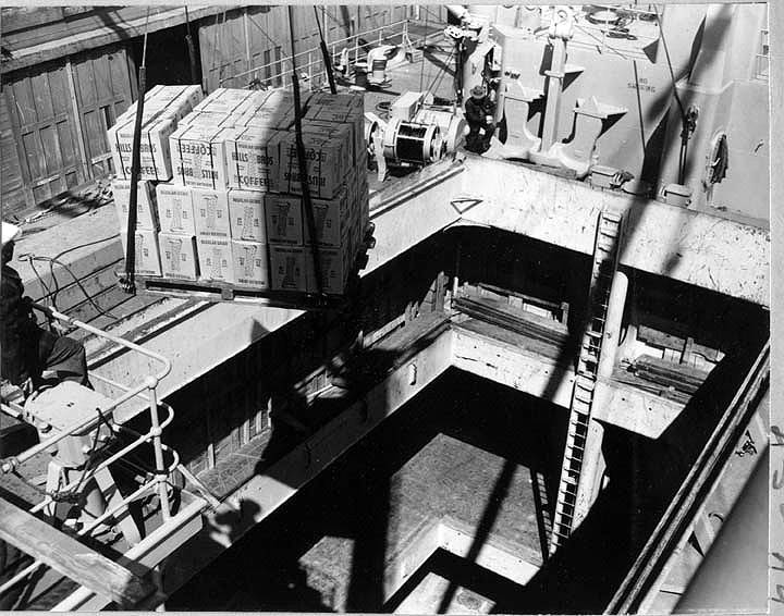Hills Brothers coffee being unloaded from freighter on San Francisco shore, mid-20th century.