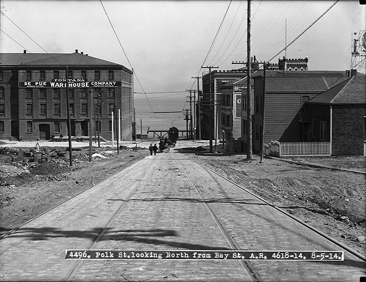 Fontana warehouse at Polk and North Point, 1914, looking north towards Bay along Polk Street.