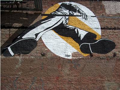 Though it has sat empty and forgotten for years now, the walls of 61 Golden Gate are still adorned with the signage of the late Hollywood Billiards. A peculiar perspective from beneath the feet of a giant, who, cue in hand, moves with a confident swagger, and stands forever; captured in the midst of a single , vast stride.