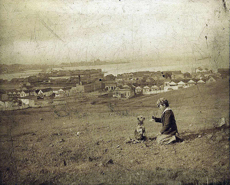 Boy with dog on the Hunters Point peninsula looking northward across India Basin, c. 1890s.