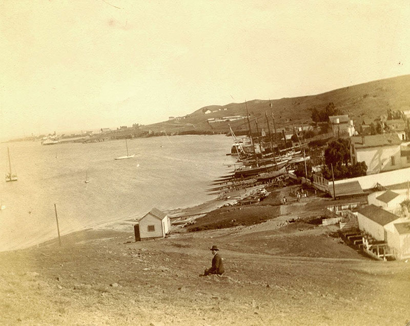 View east along southern shore of India Basin, c. 1900. Wooden shipbuilding yards in foreground, and Hunters Point repair shipyard in distance.