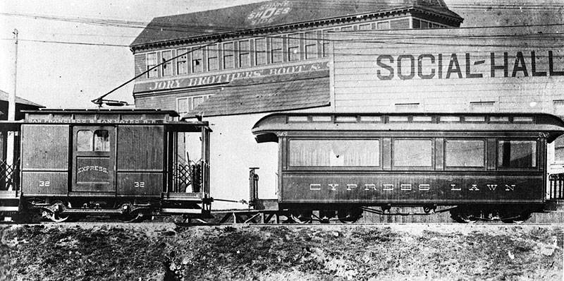 First electric funeral train on the San Francisco and San Mateo railroad line, 1898, seen here at Glen Park.