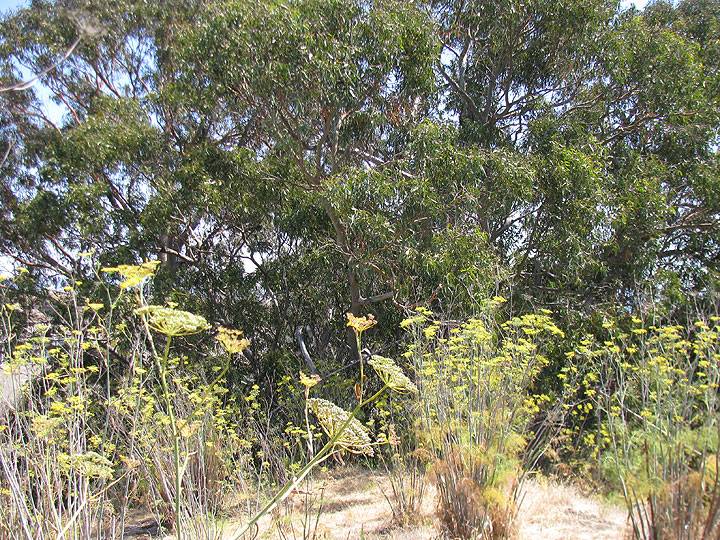 An unexpected and "unnatural" island of invasive species, fennel and eucalyptus, clusters at the top of the remains of Irish Hill in 2012.