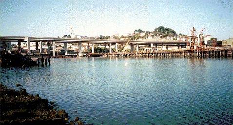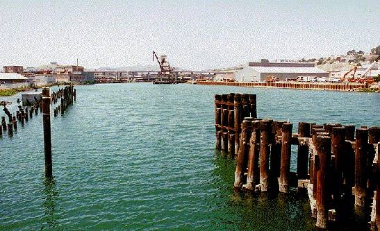 Islais Creek is now an estuary with I-280 passing over it. The old Copra loading dock is visible on the right side of this image from 1996.