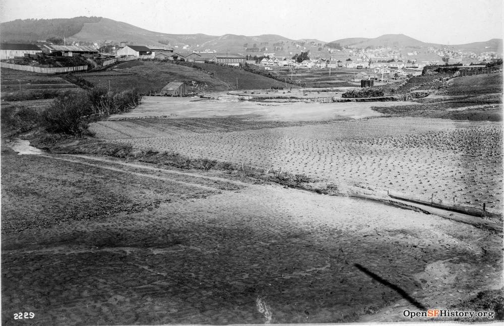 View of Islais Creek in 1918 disappearing into culvert in 1918, not far from the Geneva Car barn. Sutro Forest covers part of Mt. Davidson in upper left.