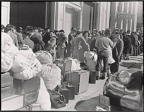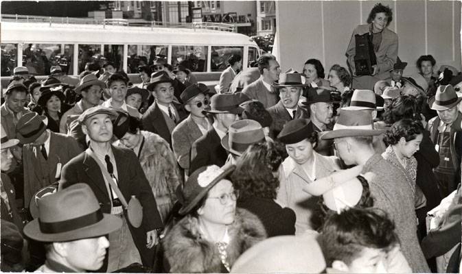 Japanese internment begins with forced evacuation from San Francisco on April 7, 1942. Dorothea Lange, well-known documentary photographer of the Depression, is on wall in background with large format camera.